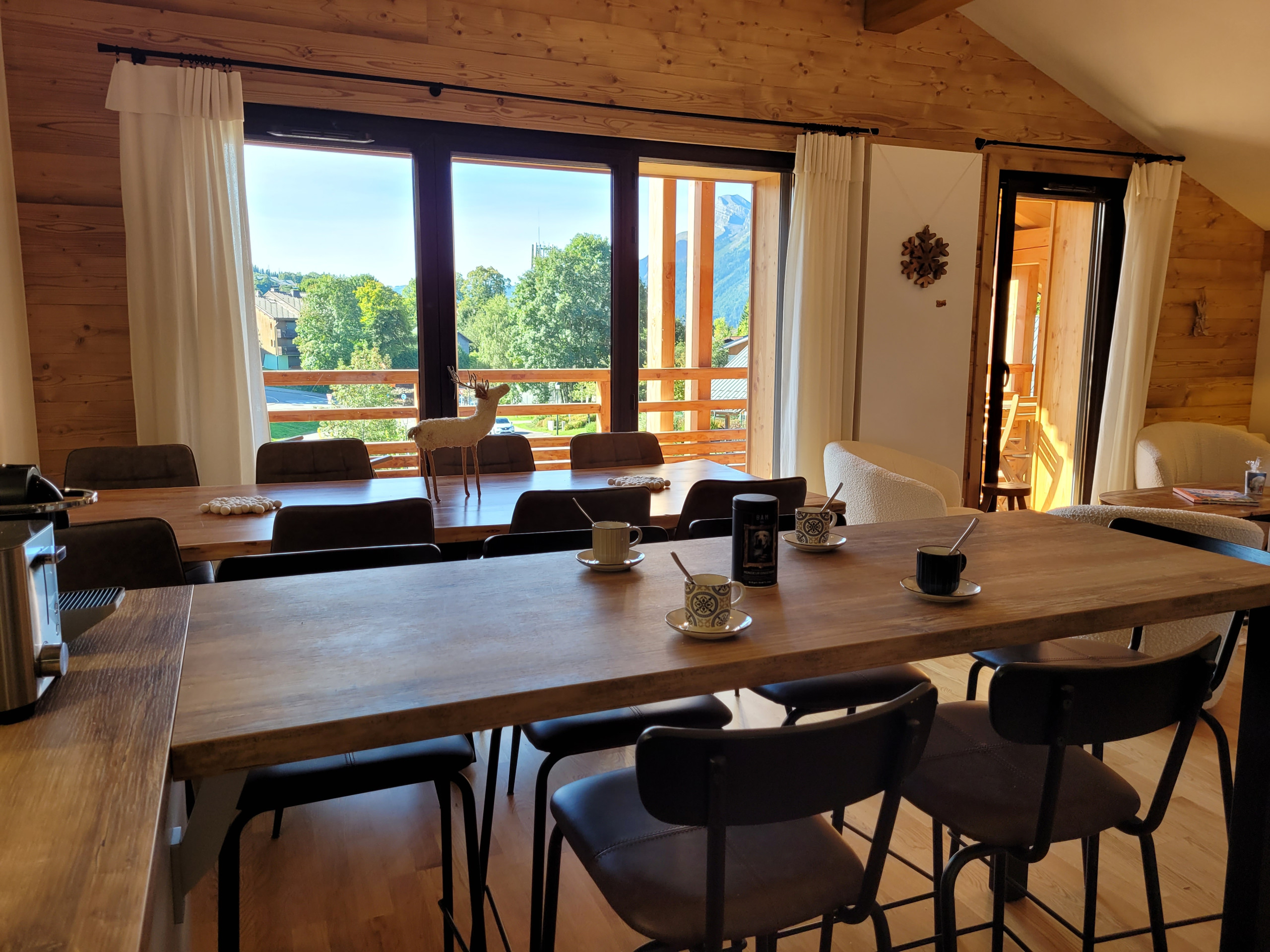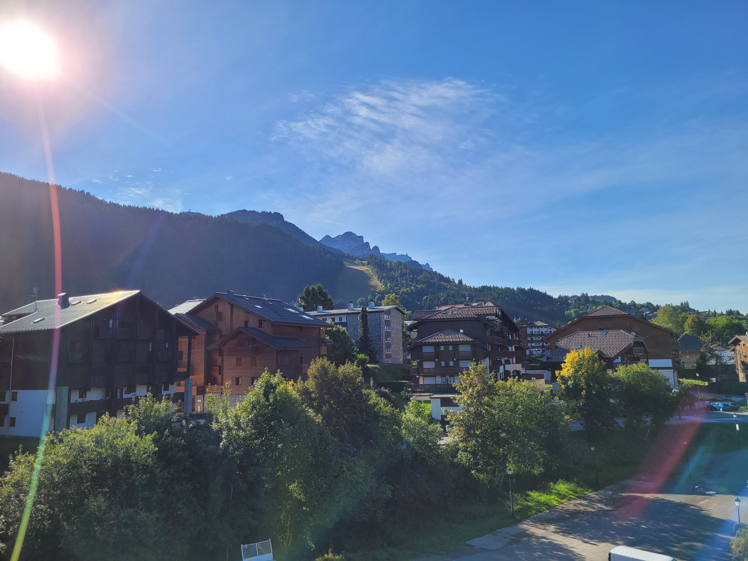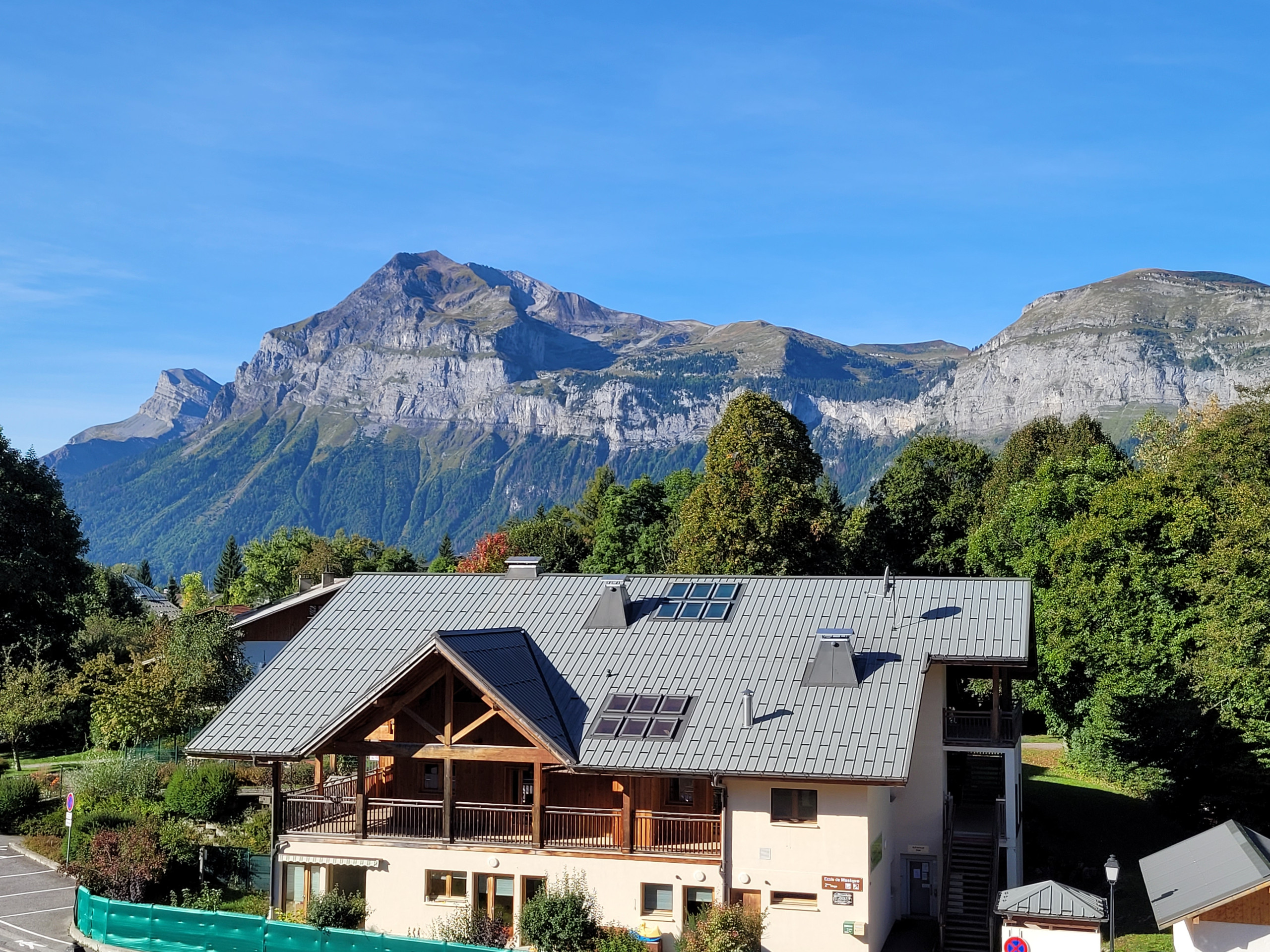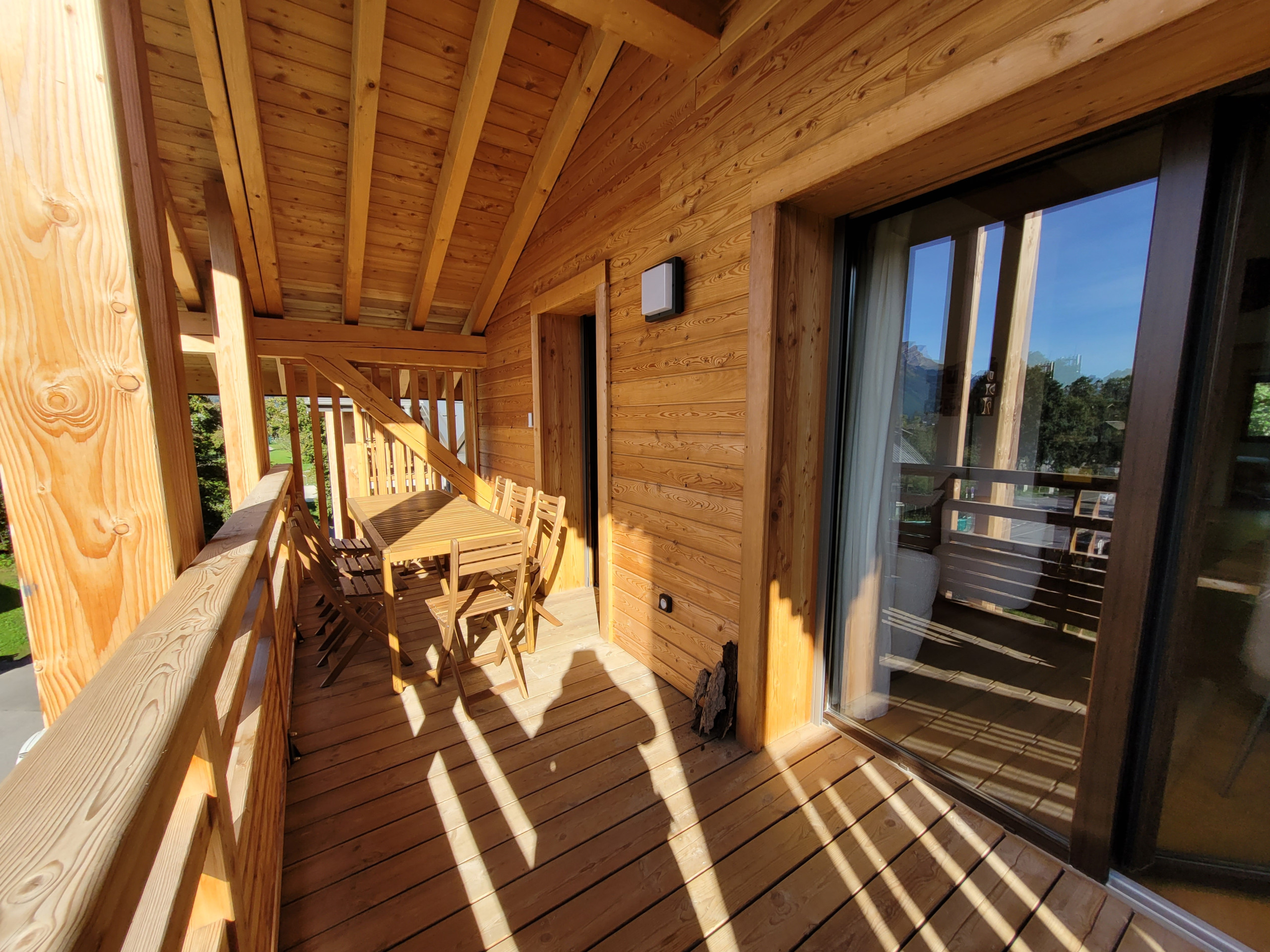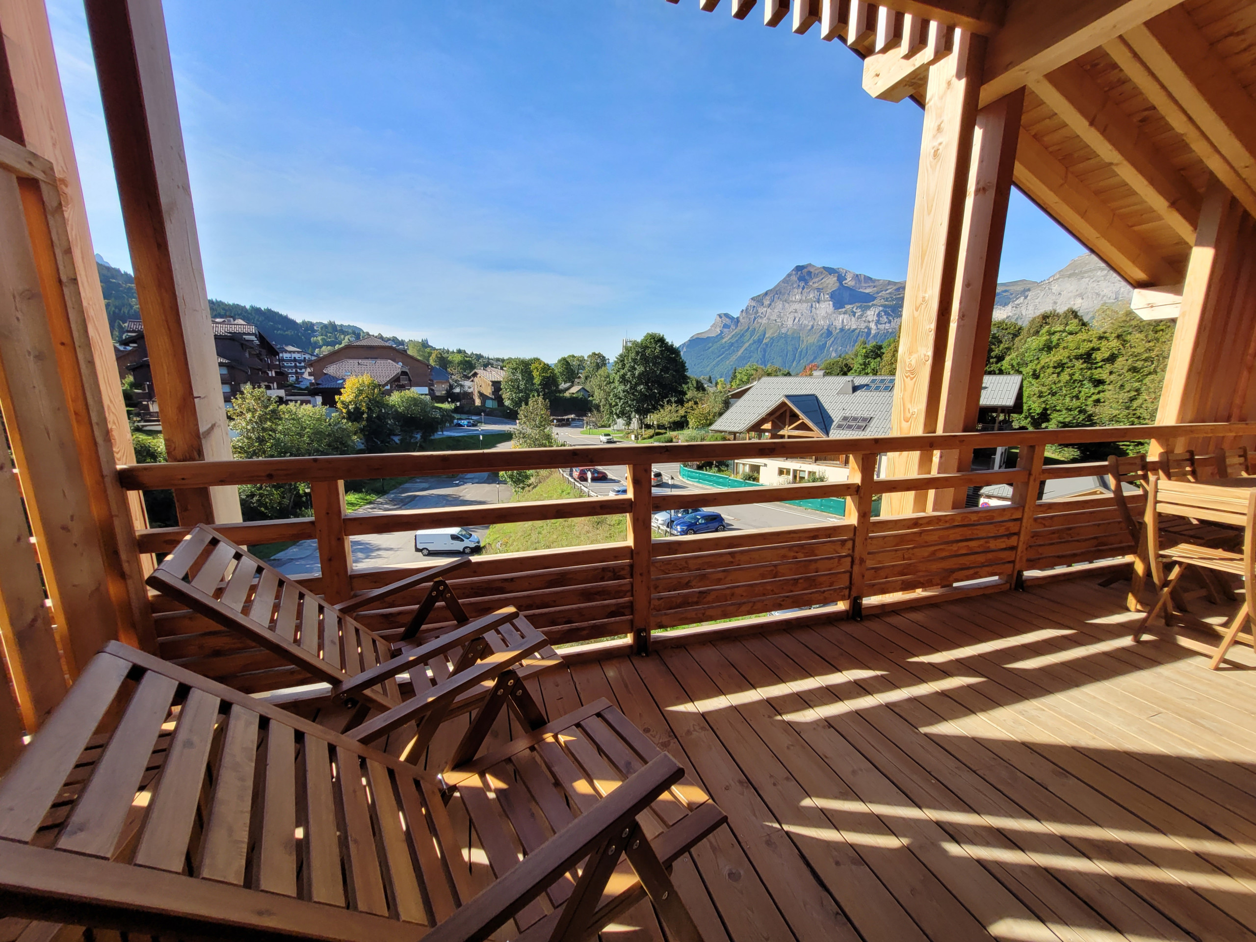 -Balcon/terrasse de 12m² avec superbe vue dégagée sur les pistes de ski (Timalet) et et la pointe d’Areu, massif des Aravis; avec mobilier de jardin (2 fauteuils 1 table et des chaises)