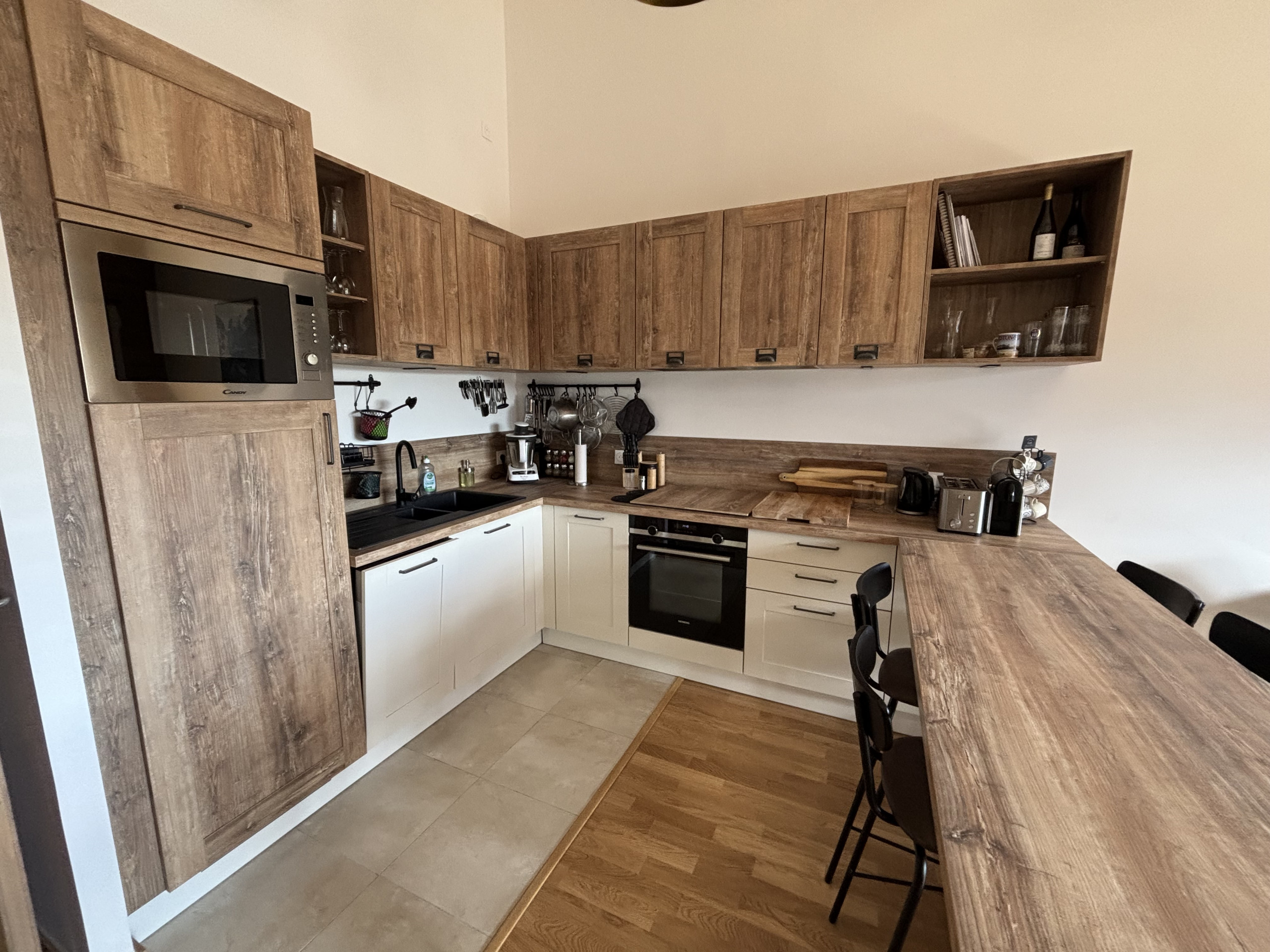plaque cuisson à induction (3 foyers), 1 four traditionnel, 1 micro-ondes, réfrigérateur avec partie congélateur, lave-vaisselle, cafetière Nespresso, bouilloire et lave vaisselle.